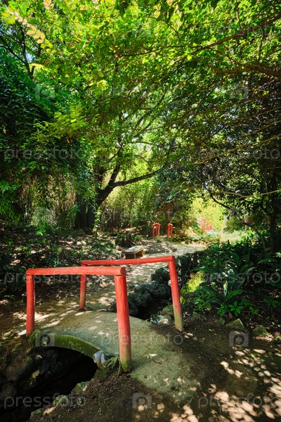 Мост в китайском стиле в азиатской части тропического ботанического сада в Лиссабоне, Португалия