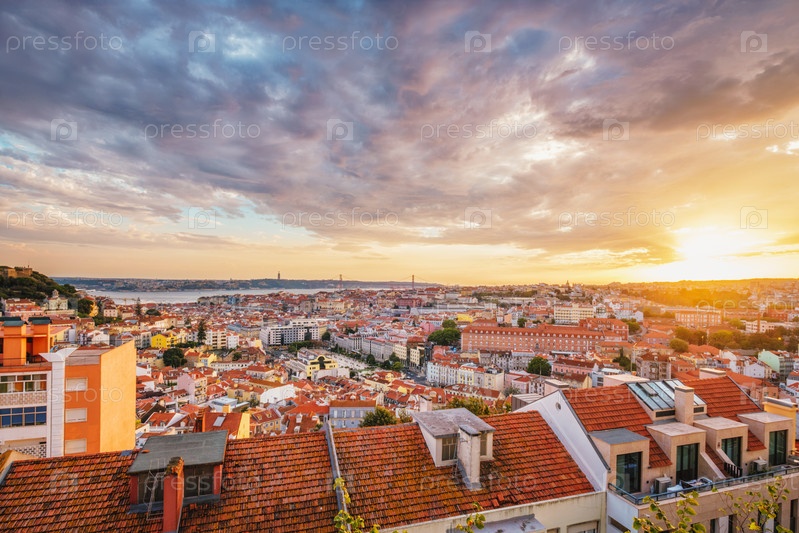 Вид на знаменитый вид Лиссабона с туристической смотровой площадки Мирадуро-да-Сеньора-ду-Монте на старый городской район Алфамы и Маурарии, мост 25 апреля на закате. Лиссабон, Португалия