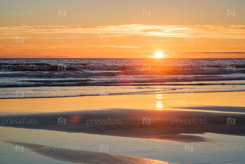 Закат Атлантического океана с бушующими волнами на пляже Фонте-да-Телья, Коста-да-Капарика, Португалия