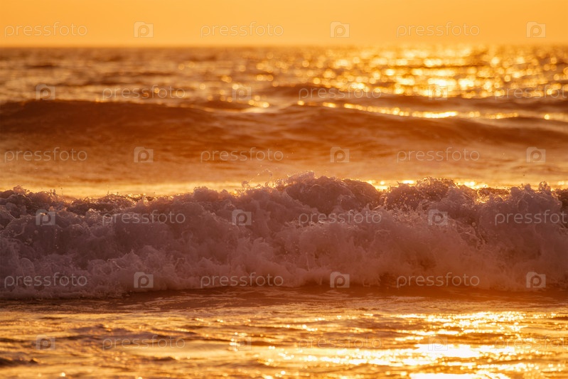 Разрыв океанской волны на закате, освещенный солнцем. Фонте-да-Телья, Кошта-да-Капарика, Португалия