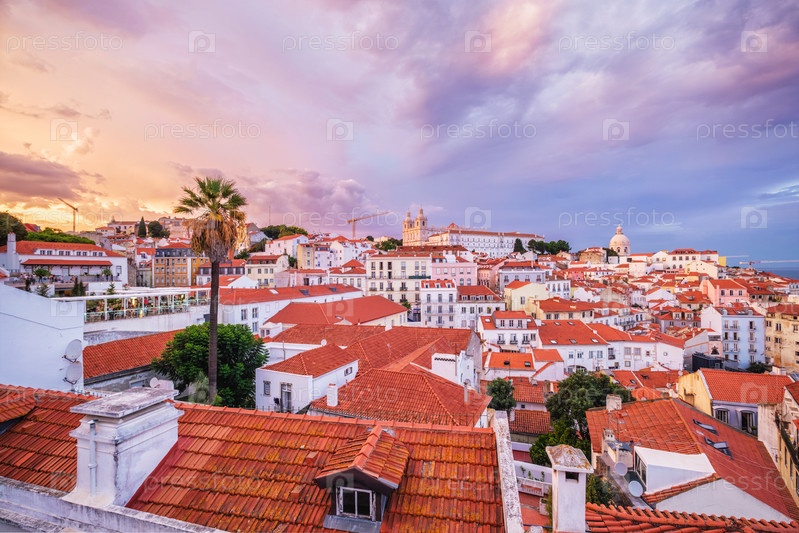 Вид на знаменитый вид Лиссабона с туристической смотровой площадки Мирадуро-де-Санта-Лузия на старый район города Алфама на закате с драматическим пасмурным небом. Лиссабон, Португалия