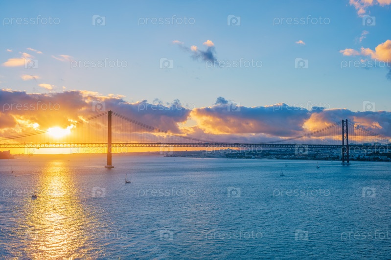 Вид на мост 25 апреля через реку Тежу на закате. Лиссабон, Португалия