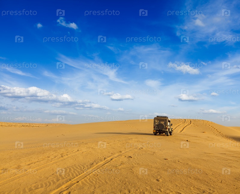 Сафари в пустыне - автомобиль с полным приводом в дюнах. Пустыня Тар, Раджастхан, Индия