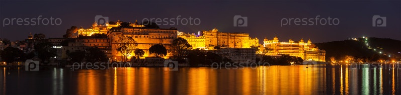 Дворец городского дворца на озере Пичола в сумерках, Удайпур, Раджаст