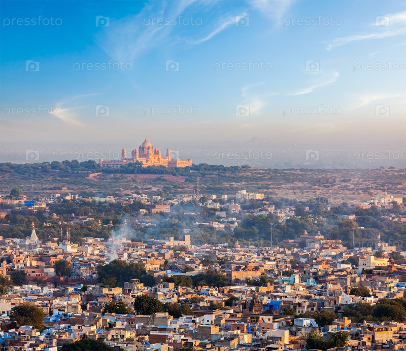 Вид с воздуха на Джодхпур - Голубой город - с дворцом Умаид Бхаван на закате. Вид из форта Мехрангарх. Джодфур, Раджастан, Индия