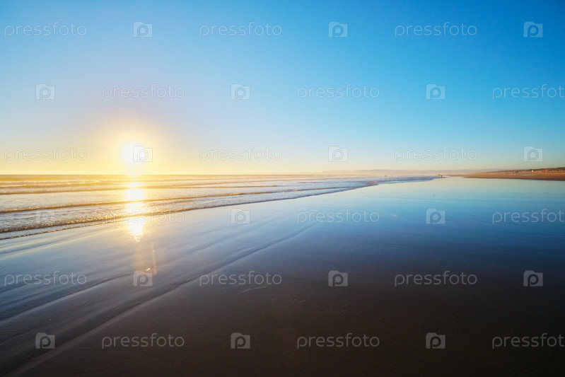 Закат Атлантического океана с солнцем и бушующими волнами на широком песке пляжа Фонте-да-Телья, Коста-да-Капарика, Португалия