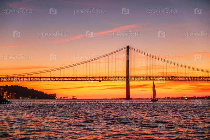 Вид на мост 25 апреля через реку Тежу на закате. Лиссабон, Португалия