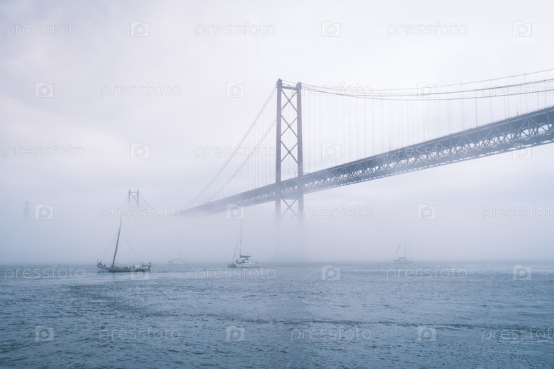 Вид на мост 25 апреля, знаменитую туристическую достопримечательность Лиссабона, соединяющую Лиссабон и Алмаду в густом тумане, под которым проходят яхты. Лиссабон, Португалия
