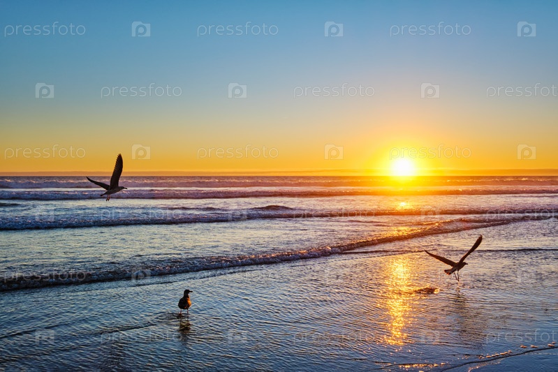 Чайки на пляже Атлантического океана, закат с бушующими волнами на пляже Фонте-да-Телья, Португалия