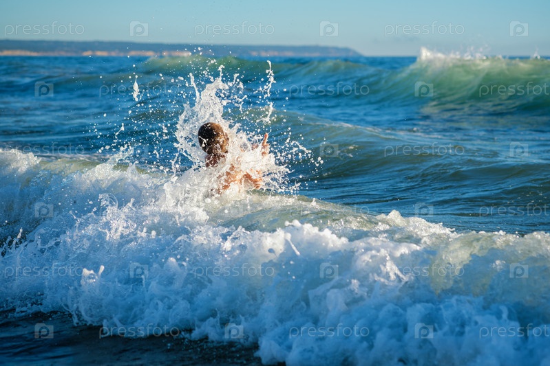 Мальчик весело прыгает в океанских морских волнах