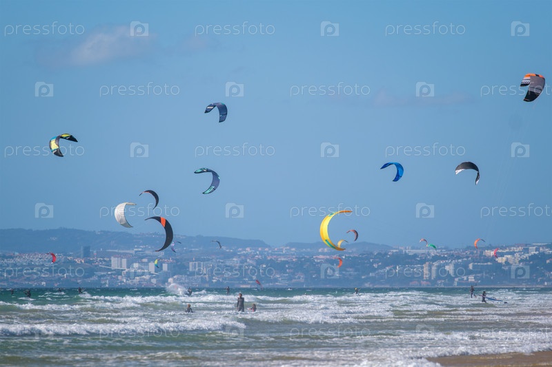 Кайтсерфинг кайтбордист кайтсерфер кайтсерфер кайтсерфер на пляже Атлантического океана на пляже Фонте-да-Телья, Коста-да-Капарика, Португалия