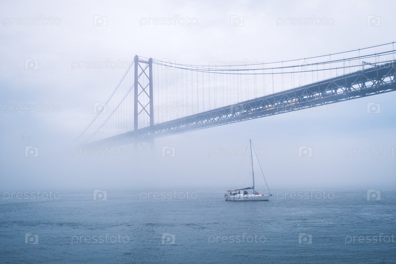 Вид на мост 25 апреля, знаменитую туристическую достопримечательность Лиссабона в густом тумане