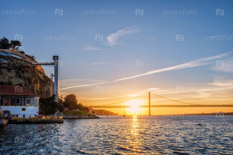 Вид на мост 25 апреля, знаменитую туристическую достопримечательность Лиссабона, через реку Тежу и лифт Бока-ду-Венто, а также приморские рестораны с людьми на закате. Лиссабон, Португалия