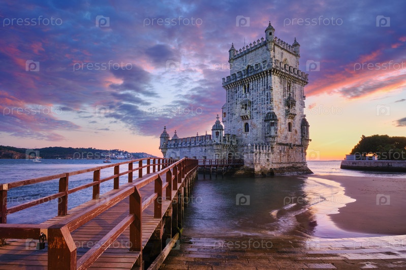Башня Белем или Башня Святого Винсента - известная туристическая достопримечательность Лиссабона и туристическая достопримечательность - на берегу реки Тежу (Тежу) в вечерних сумерках после захода солнца с драматическим небом. Лиссабон, Португалия