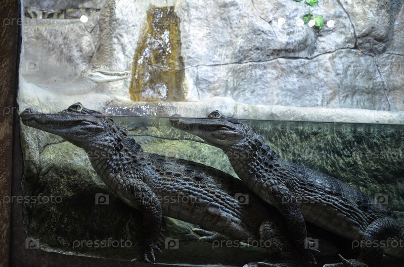 Два крокодила в бассейне в вольере зоопарка