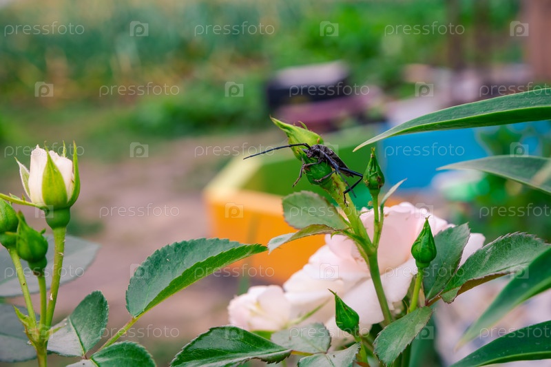 Усик коричневого жука на розовой розе. Членистоногие Насекомые отряда крылатых
