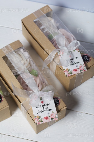 Коробочки с домашним зефиром. Связано скотчем. Видна фирменная бирка предпринимателя. Зефирные цветы. Розы из зефира. Уникальный подарок
