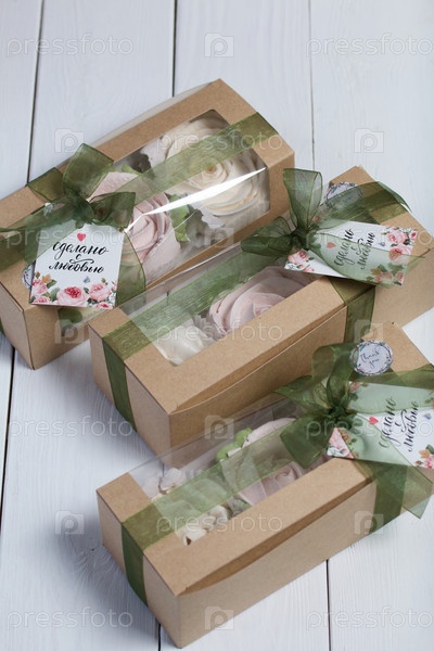 Коробочки с домашним зефиром. Связано скотчем. Видна фирменная бирка предпринимателя. Зефирные цветы. Розы из зефира. Уникальный подарок