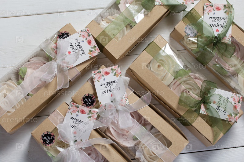 Коробочки с домашним зефиром. Связано скотчем. Видна фирменная бирка предпринимателя. Зефирные цветы. Розы из зефира. Уникальный подарок
