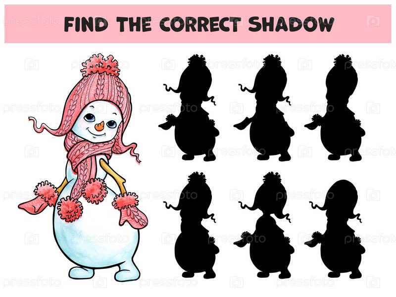 Игра найди тень. Акварельная иллюстрация милой девочки-снеговика в вязаной розовой шапке, варежках и шарфе с помпонами