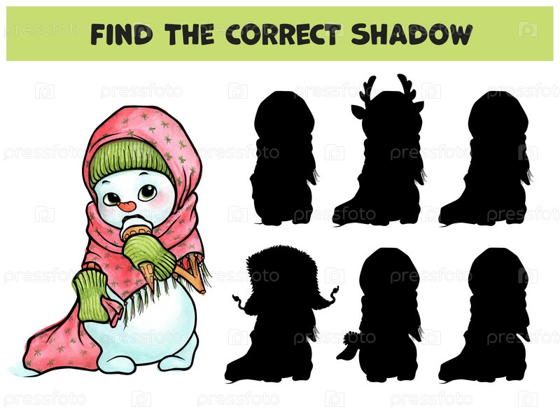 Найди правильную тень. Милая девочка-снеговик ест мороженое. Акварельная иллюстрация, нарисованная от руки