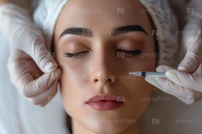 Инъекция красоты. Шприц возле лица красивой женщины крупным планом