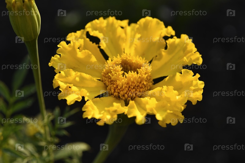 Бархатцы прямостоячие. Желтые цветы бархатцев в летнем саду. Крупные желтые цветы
