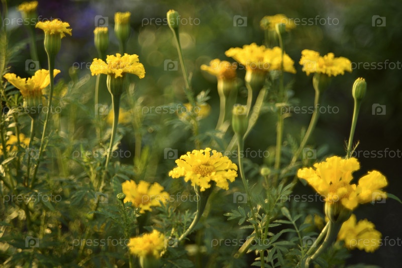 Бархатцы прямостоячие. Желтые цветы бархатцев в летнем саду. Крупные желтые цветы