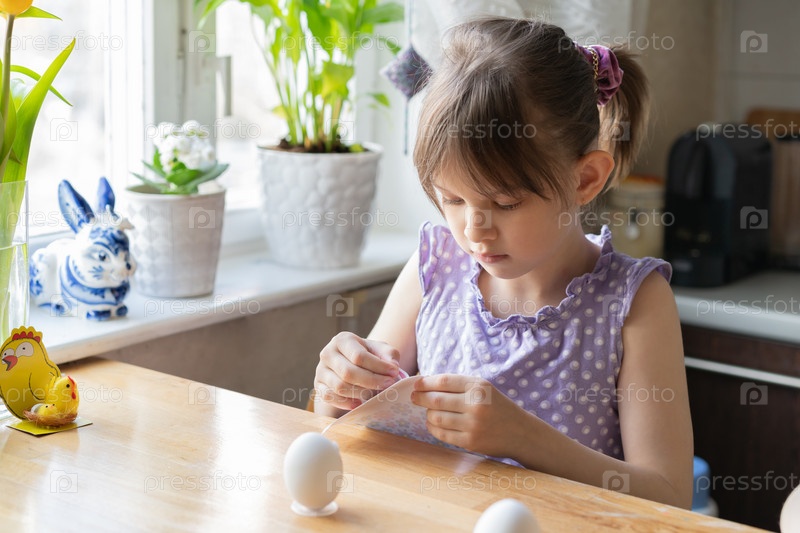 Маленькая девочка украшает пасхальные яйца