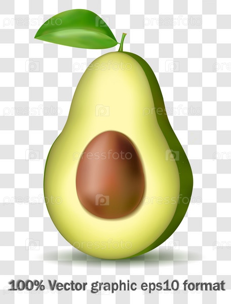 Реалистичный целый авокадо, половина с вихревыми листьями. Сочные фрукты для векторного дизайна натуральных продуктов. Разрежьте спелый авокадо косточкой для здоровой органической упаковки, дизайна меню ресторана