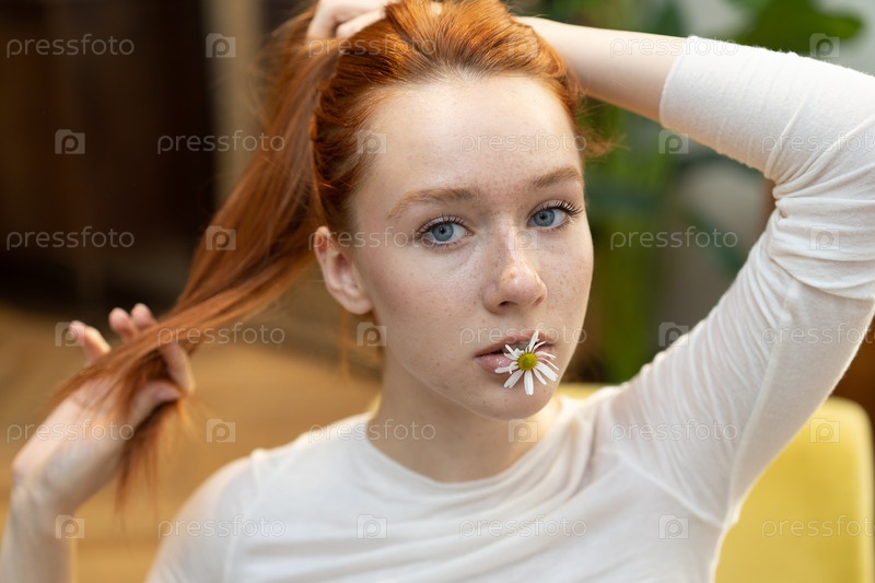 Портрет молодой красивой женщины с рыжими волосами в студии