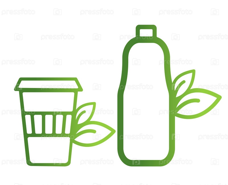 Экологичная бутылка и картонный стакан. Биоразлагаемые материалы, посуда. Экологичная еда, здоровое питание, здоровое питание. Иконки изолированы от фона