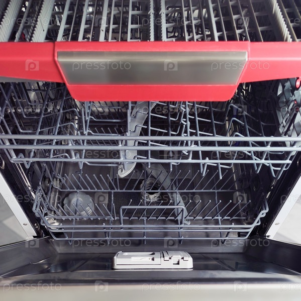 Пустая посудомоечная машина с тремя корзинами для посуды, с открытой дверцей. Вид спереди и сверху