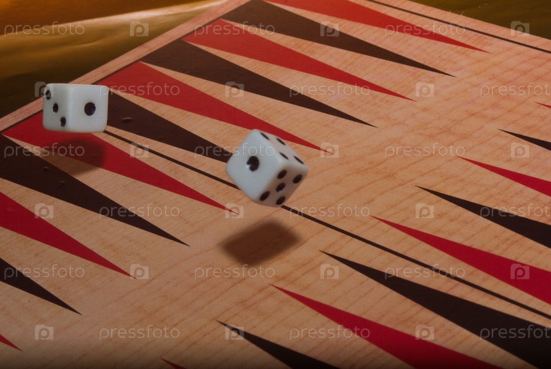 Кости на поверхности доски для игры в нарды подбрасываются и движутся