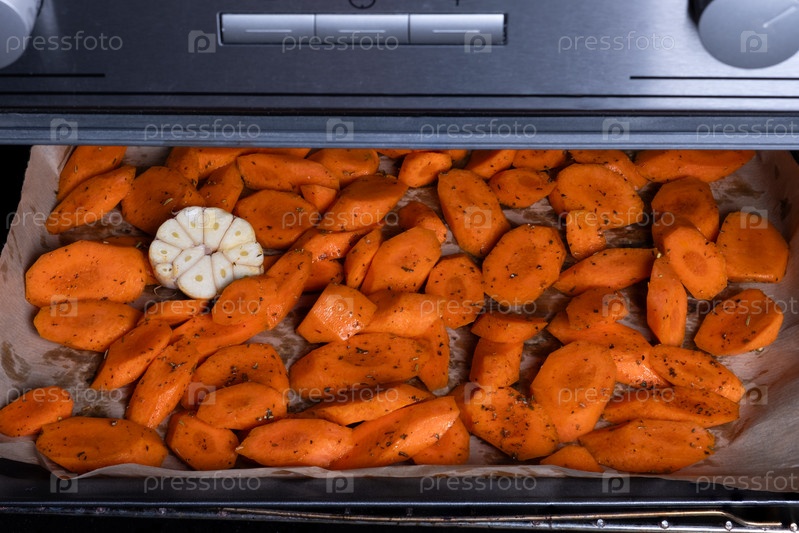 Морковь нарезать кусочками на противне в духовке. Селективный фокус