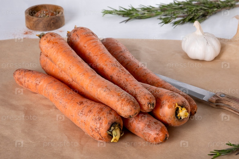 Свежая сырая морковь лежит на пергаментной бумаге на кухонном столе