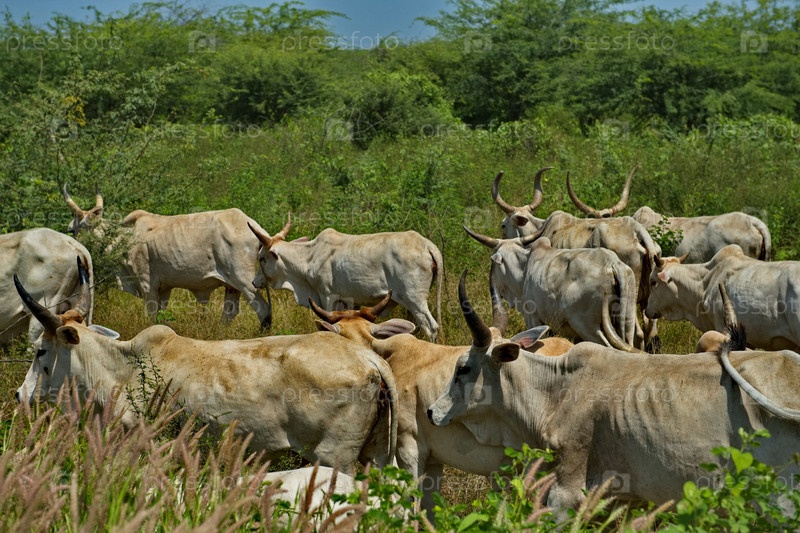 Западная Африка. Сенегал. Стадо коров Зебу с большим горбом и рогами у водопоя