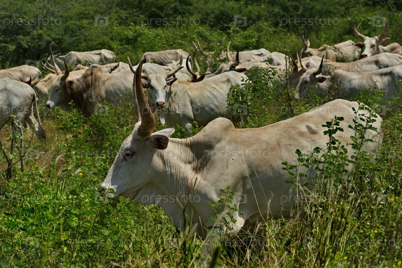 Западная Африка. Сенегал. Стадо коров Зебу с большим горбом и рогами у водопоя