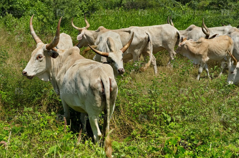 Западная Африка. Сенегал. Стадо коров Зебу с большим горбом и рогами у водопоя