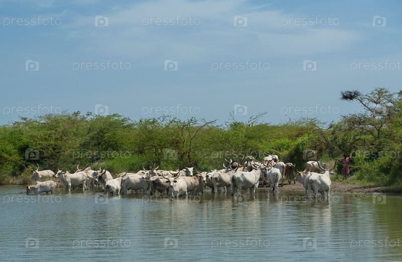 Западная Африка. Сенегал. Стадо коров Зебу с большим горбом и рогами у водопоя