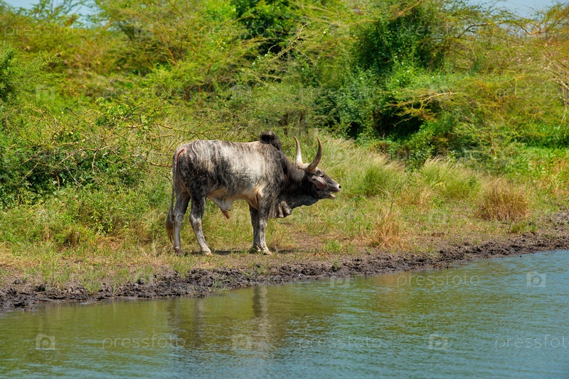 Западная Африка. Сенегал. Стадо коров Зебу с большим горбом и рогами у водопоя