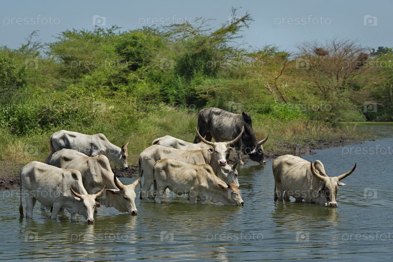 Западная Африка. Сенегал. Стадо коров Зебу с большим горбом и рогами у водопоя