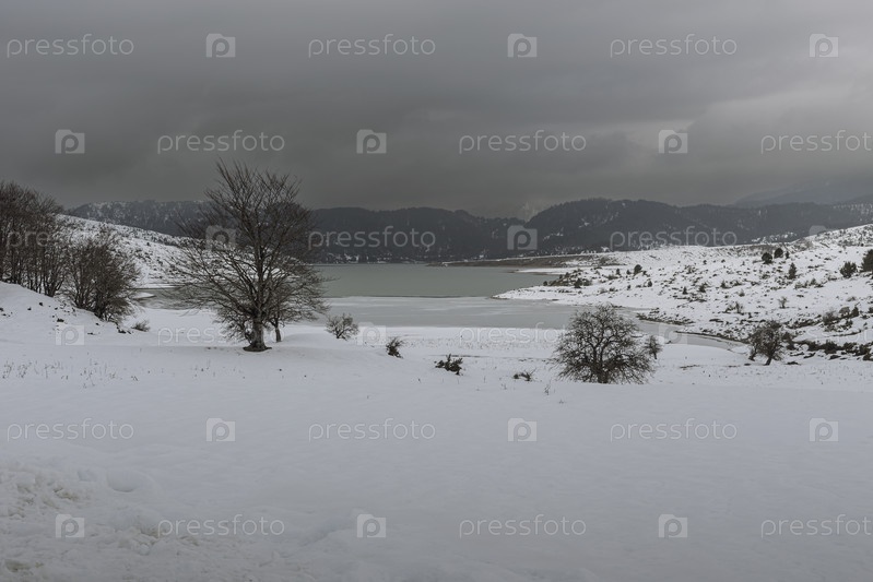 Озеро источников Аоос в горах (регион Эпир, Греция) зимой в пасмурный день