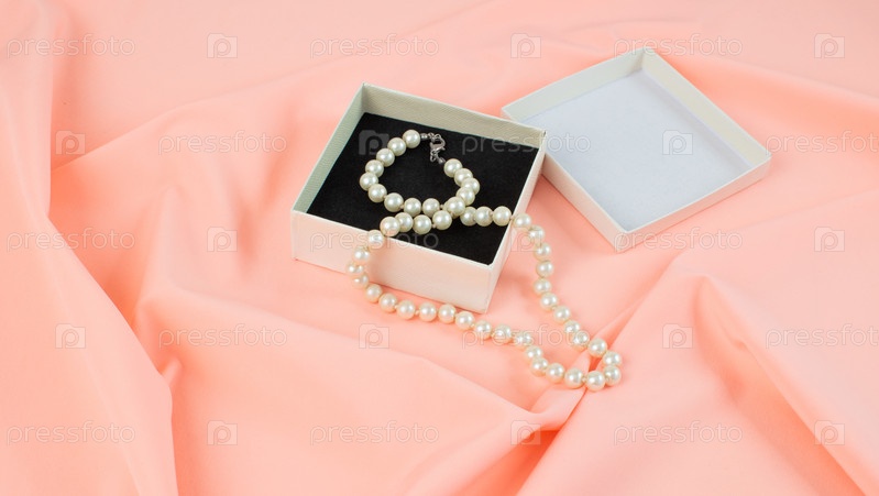 На розовом драпированном фоне стоит белая коробочка с жемчужными бусинами