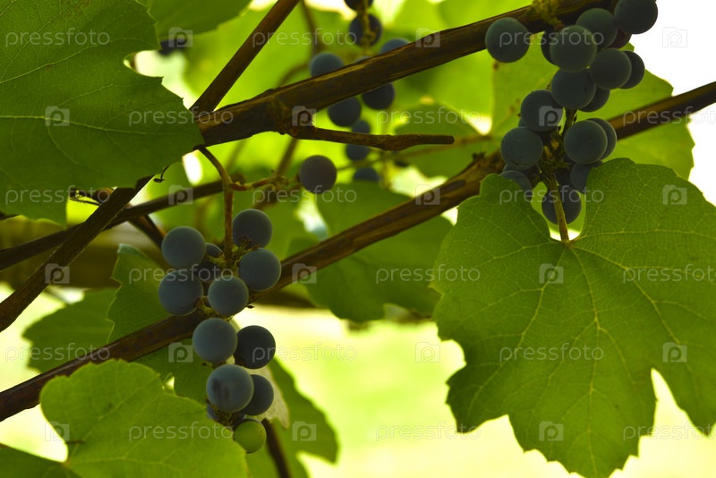 Плоды молодого винограда на лозе. Фиолетовые плоды домашнего винограда