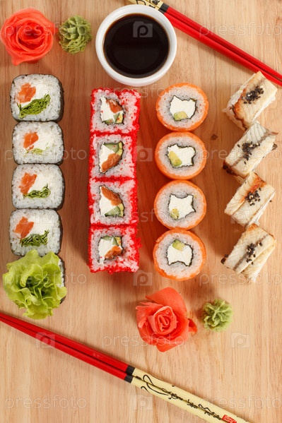 Японская еда. Различные кусочки рулонов на деревянной доске. Вид сверху