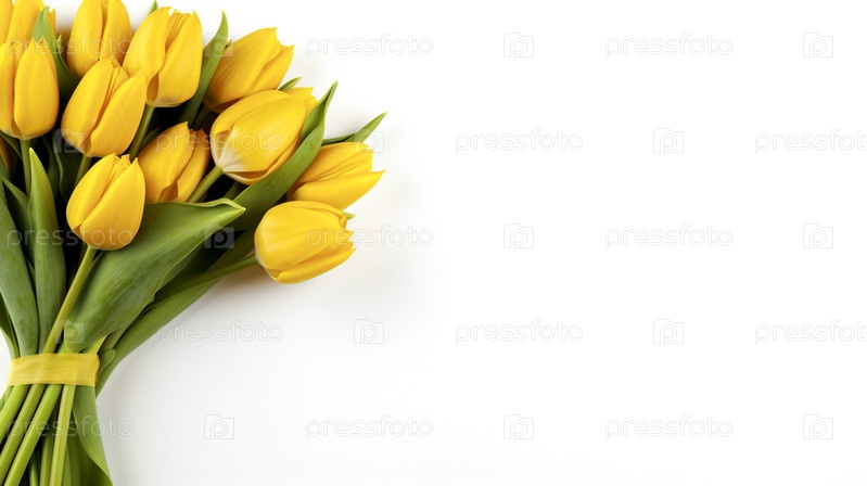 Баннер на белом фоне, букет желтых тюльпанов, перевязанный желтой лентой, справа, пустое место для текста
