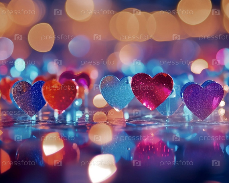 Красные, синие, голубые и фиолетовые стеклянные сердечки на размытом огненном фоне, фоне или поздравительной открытке на день святого валентина, день матери или день рождения
