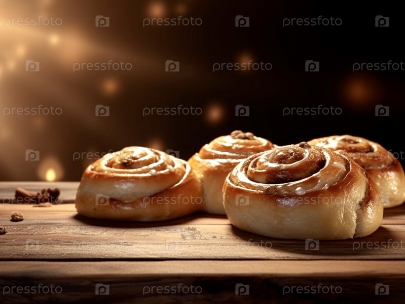 Аппетитные булочки Sinnbone лежат на деревянном столе с боковой стороной в заднем плане