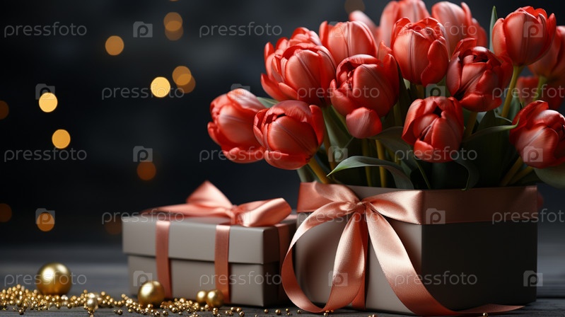 В бежевой подарочной коробке букет красных тюльпанов, рядом подарок и рассыпанные золотые бусины
